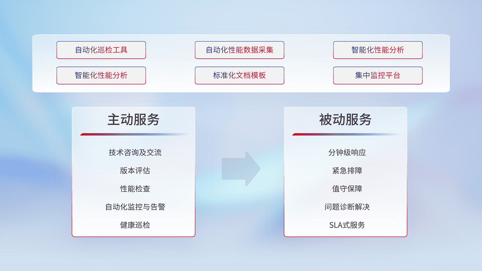 智能化工具和标准化文档,,保障服务质量,,,,提供主动服务(包含技术咨询、、、、版本评估、、、、性能检查、、、自动化监控与告警、、、、健康巡检)和被动服务包含(分钟级响应、、、、紧急排障、、值守保障、、、问题诊断解决、、、SLA服务)。。
