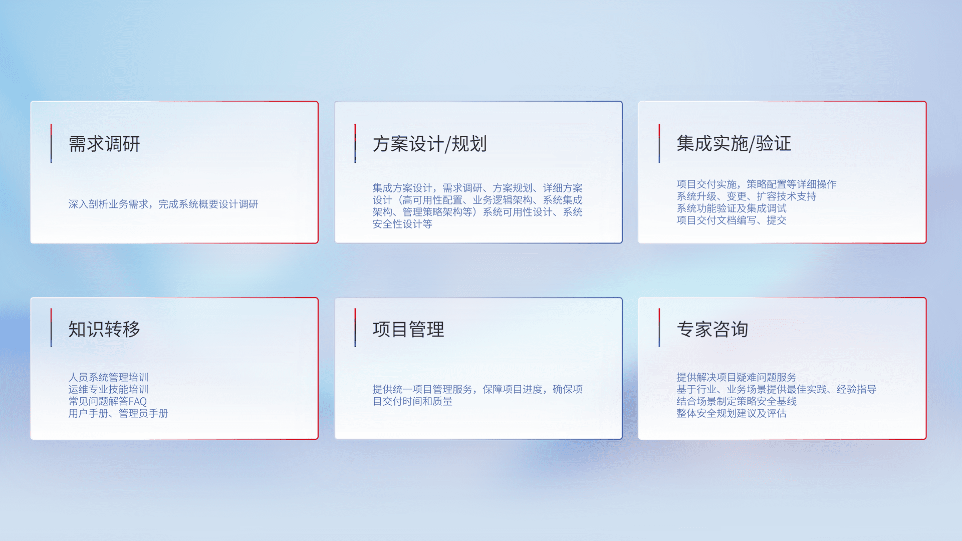 针对客户行业特性,,,将宏观的安全战略和需求,,,,通过专业的交付服务,,,实现项目落地,,,为客户提供标准规范的集成交付服务。。